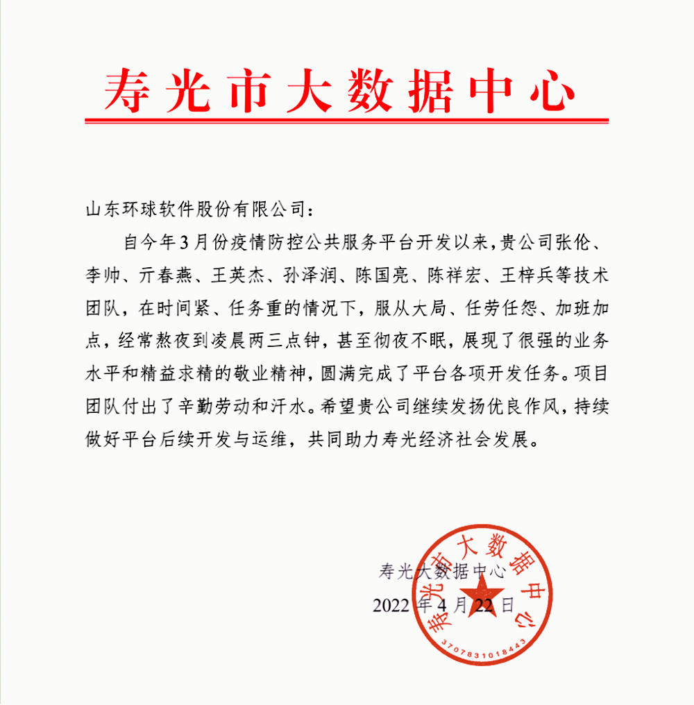 4月22日,壽光市大(da)數據中心(xin)給環(huan)球軟件發來感謝信,對環(huan)球軟件在疫情防(fang)控(kong)公共服務(wu)平臺項目上的(de)高(gao)度重(zhong)視以及對項目組成員的(de)優秀工(gong)作表現(xian)予(yu)以表揚(yang)!