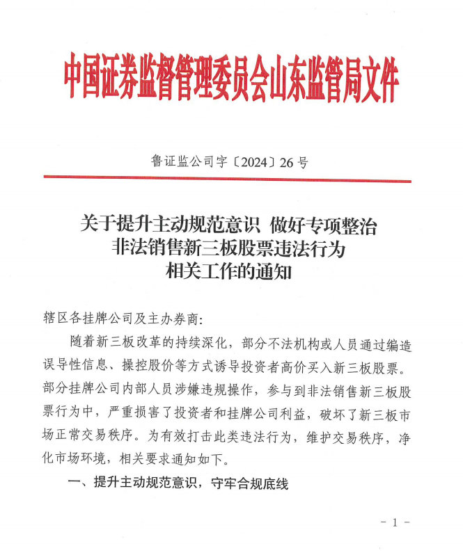 隨(sui)著新三(san)板(ban)改革(ge)的(de)持續深入(ru),部(bu)分不法(fa)(fa)機構(gou)或人員通過與掛(gua)牌(pai)公司(si)內(nei)部(bu)人員串通等,以編造誤導性信息、操縱股價等方式誘(you)導投資者(zhe)高價買(mai)入(ru)新三(san)板(ban)股票(piao),嚴重損害(hai)了投資者(zhe)和掛(gua)牌(pai)公司(si)利益,破(po)壞(huai)了新三(san)板(ban)市場正常交(jiao)易秩(zhi)序(xu)。為有效打擊此類違(wei)法(fa)(fa)行(xing)為,山東證監(jian)局向轄區掛(gua)牌(pai)公司(si)及(ji)主辦(ban)券商印發了《關(guan)(guan)于提升主動規范意識(shi),做好專項整(zheng)治非(fei)法(fa)(fa)銷售新三(san)板(ban)股票(piao)違(wei)法(fa)(fa)行(xing)為相關(guan)(guan)工作(zuo)的(de)通知》(魯證監(jian)公司(si)字[2024]26號)。