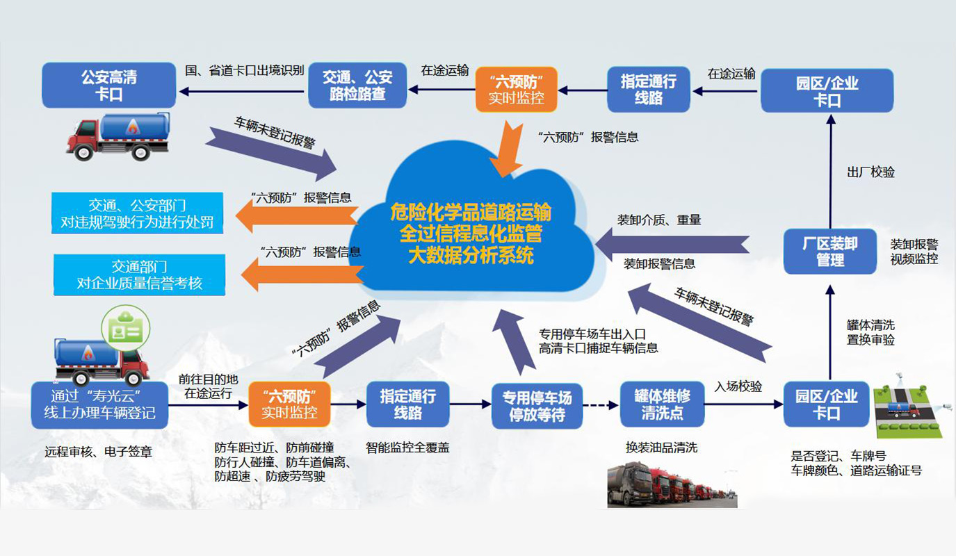 “統一(yi)體系”實現一(yi)整(zheng)套危險(xian)化學(xue)品運(yun)輸信(xin)息化全過程安全監管綜(zong)合體系。