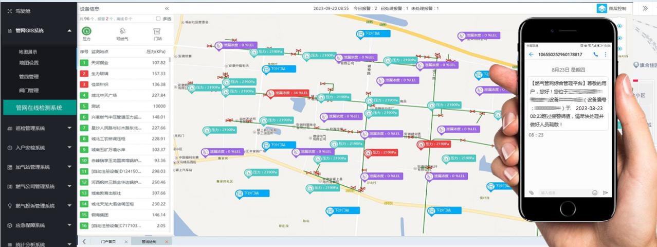 基于互聯網(wang)(wang)技(ji)術,將分散在(zai)(zai)各地的(de)管網(wang)(wang)監(jian)測點(dian)的(de)數據(管網(wang)(wang)壓力、氣(qi)體泄露濃度等)實時傳送到監(jian)控(kong)中(zhong)心,形成以監(jian)控(kong)中(zhong)心為核心輻射(she)整個管網(wang)(wang)的(de)分布式監(jian)控(kong)網(wang)(wang)絡(luo),使在(zai)(zai)線監(jian)測不存(cun)在(zai)(zai)盲區。指標出現異常時自(zi)動發送報警短信,將安全隱患撲(pu)滅在(zai)(zai)萌芽(ya)狀態(tai)。