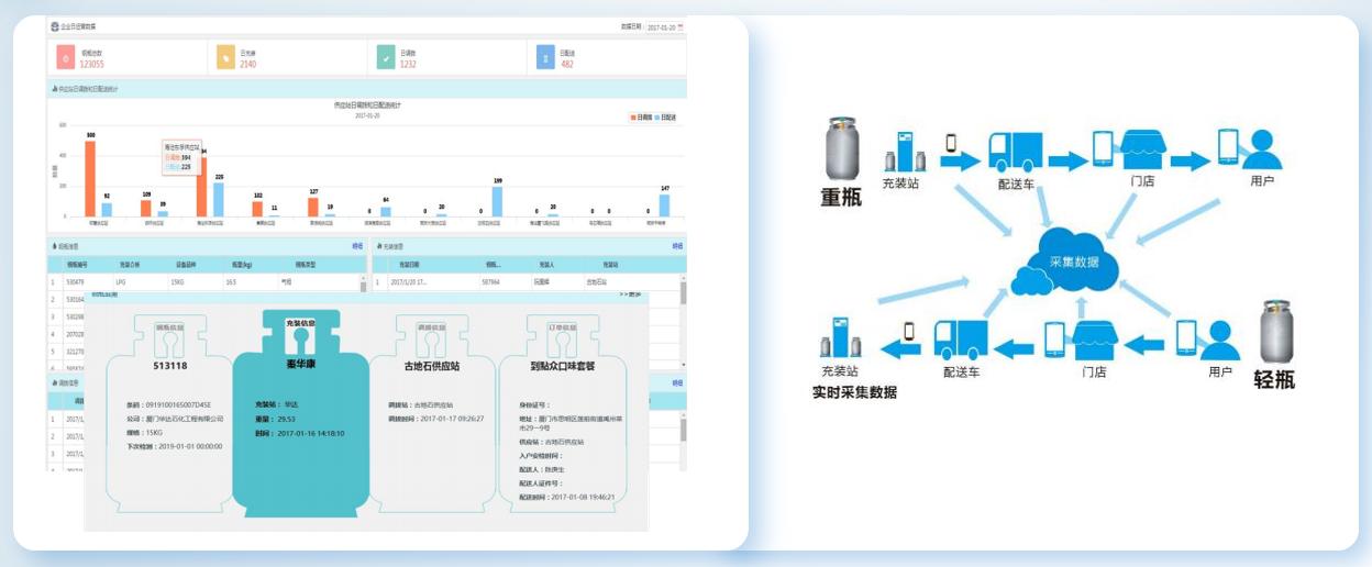 針對液化(hua)石油氣監(jian)(jian)管的痛點,平臺為客戶建(jian)立了(le)城市范圍內(nei)鋼瓶(ping)從生(sheng)產(chan)制造、充裝(zhuang)、檢驗、配送的全(quan)(quan)流程監(jian)(jian)管方(fang)案。采用“一(yi)瓶(ping)一(yi)碼”、“一(yi)瓶(ping)一(yi)檔”的方(fang)式,實現追蹤溯源(yuan),解決了(le)氣瓶(ping)充裝(zhuang)記錄智(zhi)能化(hua)的問題。這種全(quan)(quan)流程監(jian)(jian)管方(fang)案不(bu)僅提高了(le)鋼瓶(ping)管理的效率和安全(quan)(quan)性,還(huan)確保了(le)鋼瓶(ping)在全(quan)(quan)生(sheng)命(ming)周期內(nei)的有(you)效監(jian)(jian)控。