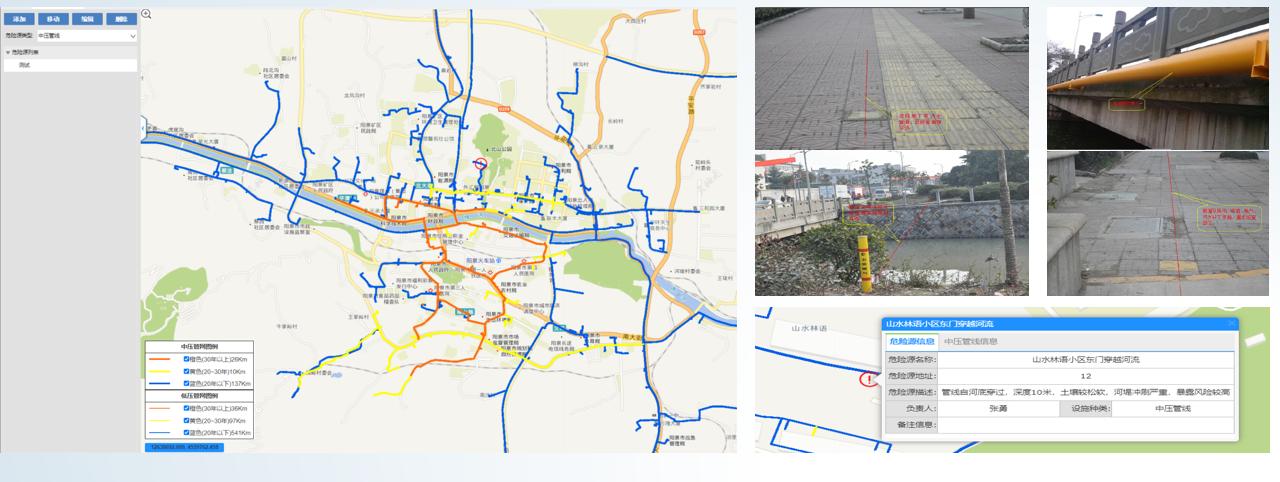 按管(guan)線年限,泄漏次數(shu),防腐(fu)破損次數(shu),埋深不足次數(shu),封閉(bi)占壓次數(shu),管(guan)網周邊環境等因(yin)素進行綜合(he)評(ping)估,確定管(guan)段(duan)的(de)風險等級,自(zi)動以不同顏色進行標(biao)記,形成管(guan)網風險情(qing)況分布圖。