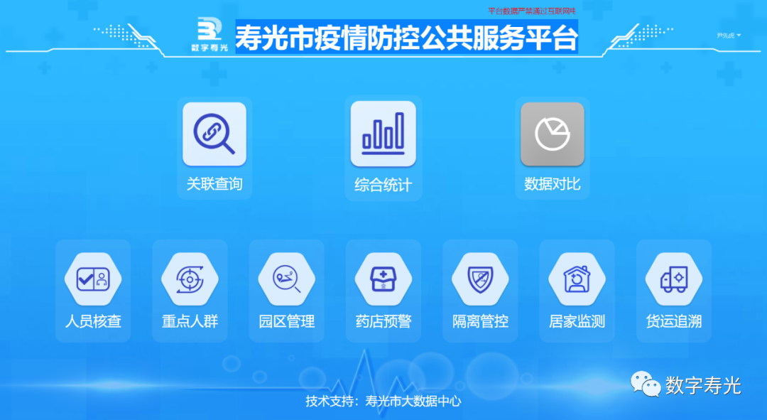 一是急用為先,逐步完善,搭建疫情防控公共平臺。以“系統整合、數據共享、充分利舊、簡便實用”為基本原則,以“底層數據打通、中間業務關聯、上層入口統一”為基礎框架,打通系統間的數據,建成一體多能的疫情防控公共服務平臺。平臺對(dui)原有在用的(de)(de)貨運追溯、人(ren)(ren)員流調、隔(ge)離點管理、人(ren)(ren)員排查(cha)、藥店預警、居家(jia)健康監(jian)測等6個疫(yi)情(qing)(qing)(qing)防(fang)(fang)(fang)控(kong)系統進行優化整合(he),新增(zeng)關(guan)聯查(cha)詢、綜合(he)統計(ji)、數(shu)(shu)(shu)據(ju)比(bi)對(dui)、重(zhong)點人(ren)(ren)群、流動(dong)人(ren)(ren)口、物流園管理等6個功能(neng)模塊,全面(mian)整合(he)匯聚壽光市相關(guan)單位疫(yi)情(qing)(qing)(qing)防(fang)(fang)(fang)控(kong)業務數(shu)(shu)(shu)據(ju),申請對(dui)接(jie)上級返還數(shu)(shu)(shu)據(ju),搭建起統一的(de)(de)疫(yi)情(qing)(qing)(qing)防(fang)(fang)(fang)控(kong)數(shu)(shu)(shu)據(ju)庫,有效支撐各工作專班、市直部門(men)單位和(he)鎮街(jie)的(de)(de)疫(yi)情(qing)(qing)(qing)防(fang)(fang)(fang)控(kong)數(shu)(shu)(shu)據(ju)需求,實(shi)現疫(yi)情(qing)(qing)(qing)防(fang)(fang)(fang)控(kong)工作的(de)(de)全流程閉環管理。